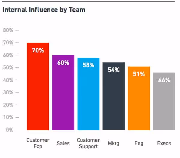 First of all, there’s no surprise that customer-focused functions dominated the top spots for this question, as any customer-centric organization is going to put the customer at the front of the line when it comes to new features and functionality. Customer Experience will be primarily bringing proactive elements to the user base (i.e. how can we make things better and easier) Customer Support brings a reactive focus to the process (this is what customers are complaining about, etc.).